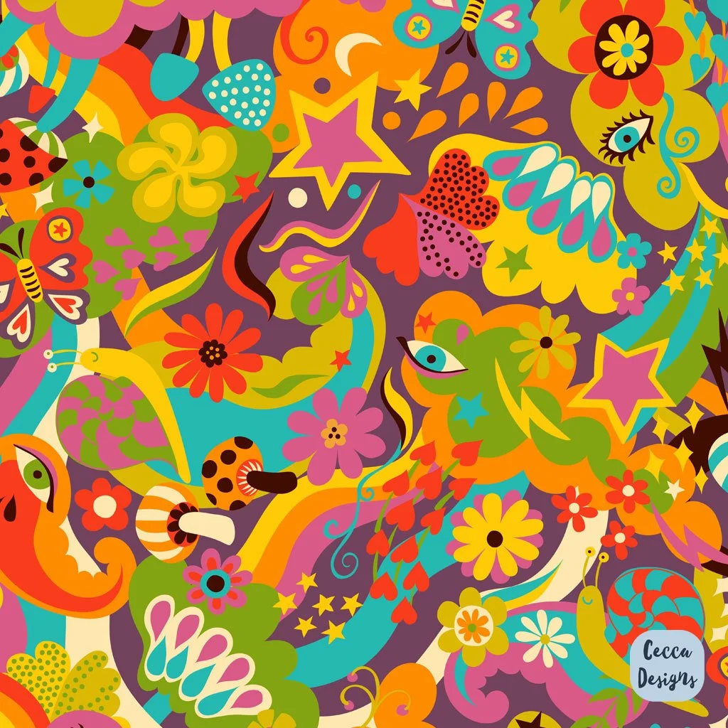 1970s Disco Psychedelia is a bold, high-energy pattern collection inspired by the carefree spirit and expressive style of the disco era. Bursting with colour and movement, the designs channel a playful, psychedelic aesthetic influenced by vintage 1970s graphics and retro dancefloor culture.