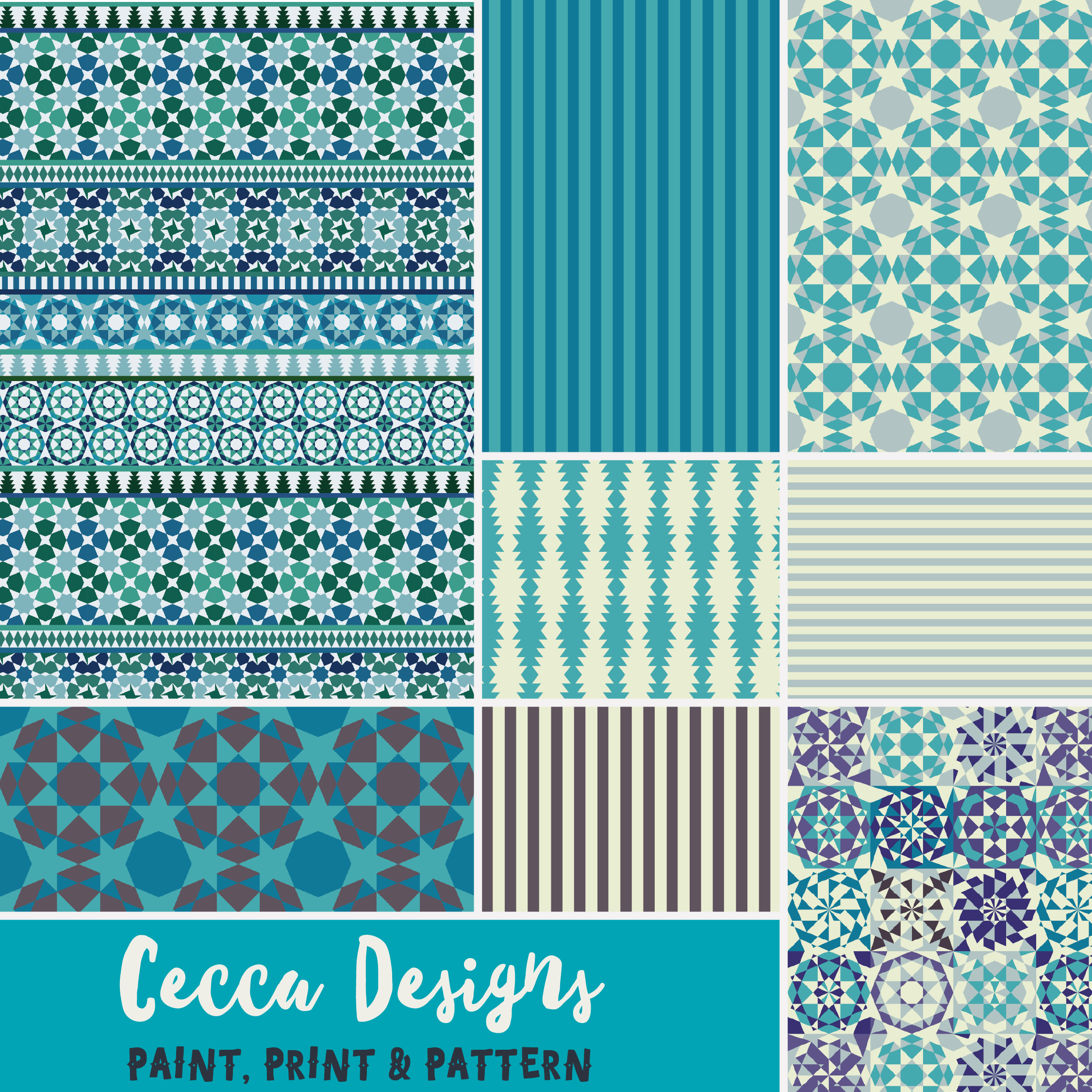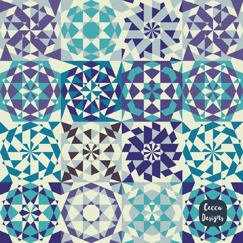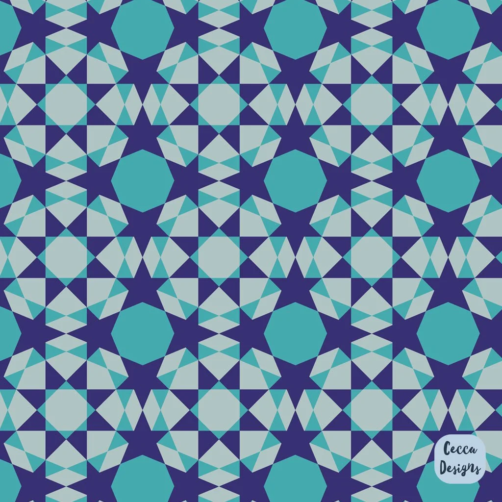 A collection of pattern designs inspired by the stunning tiles of the Alhambra Palace in Granada, Spain. A geometric collection celebrating the influence of Islamic art and the beauty of tesselation! Please get in touch if you would like to discuss possible licensing options - email me at hello@ceccadesigns.com
